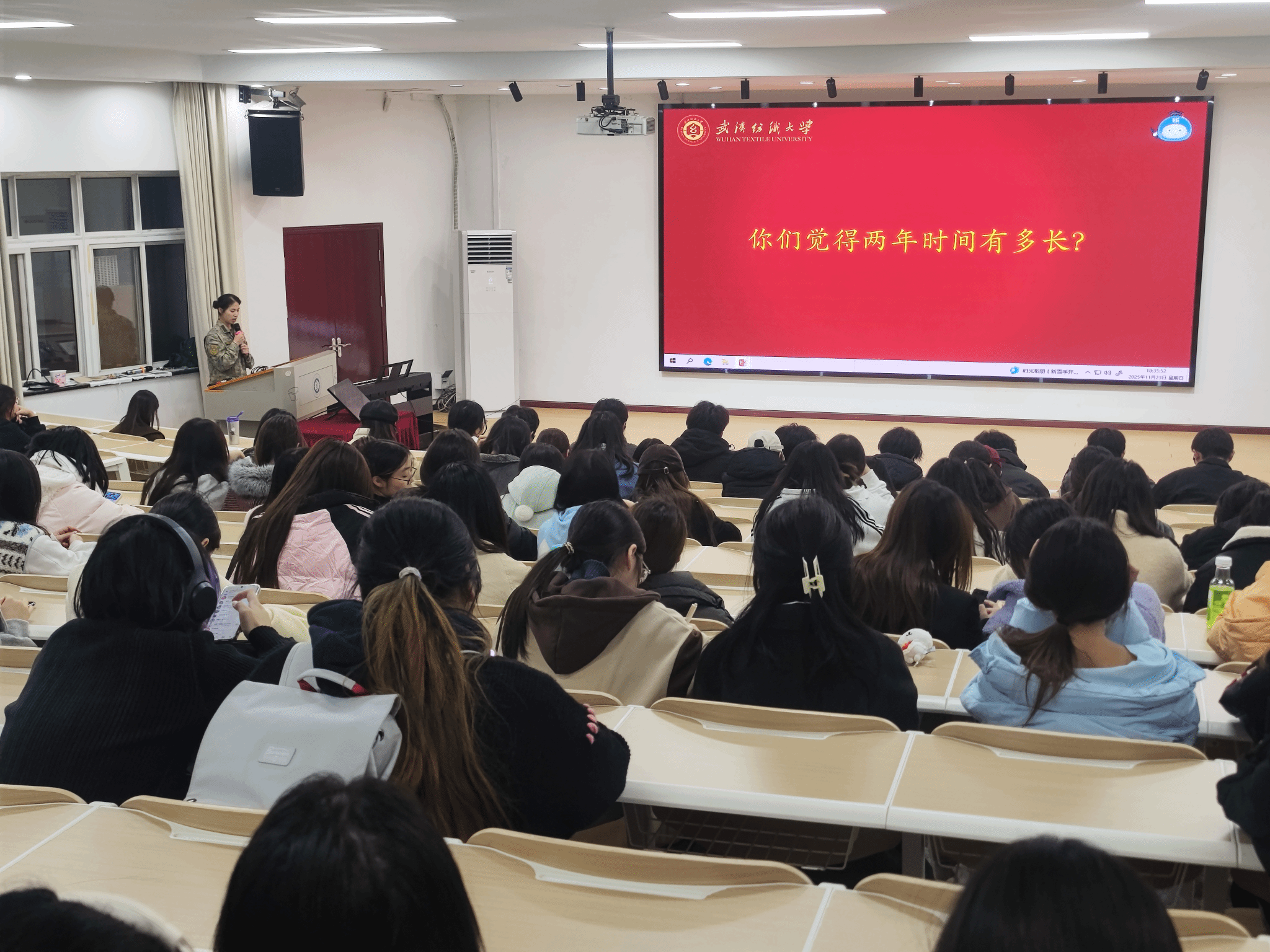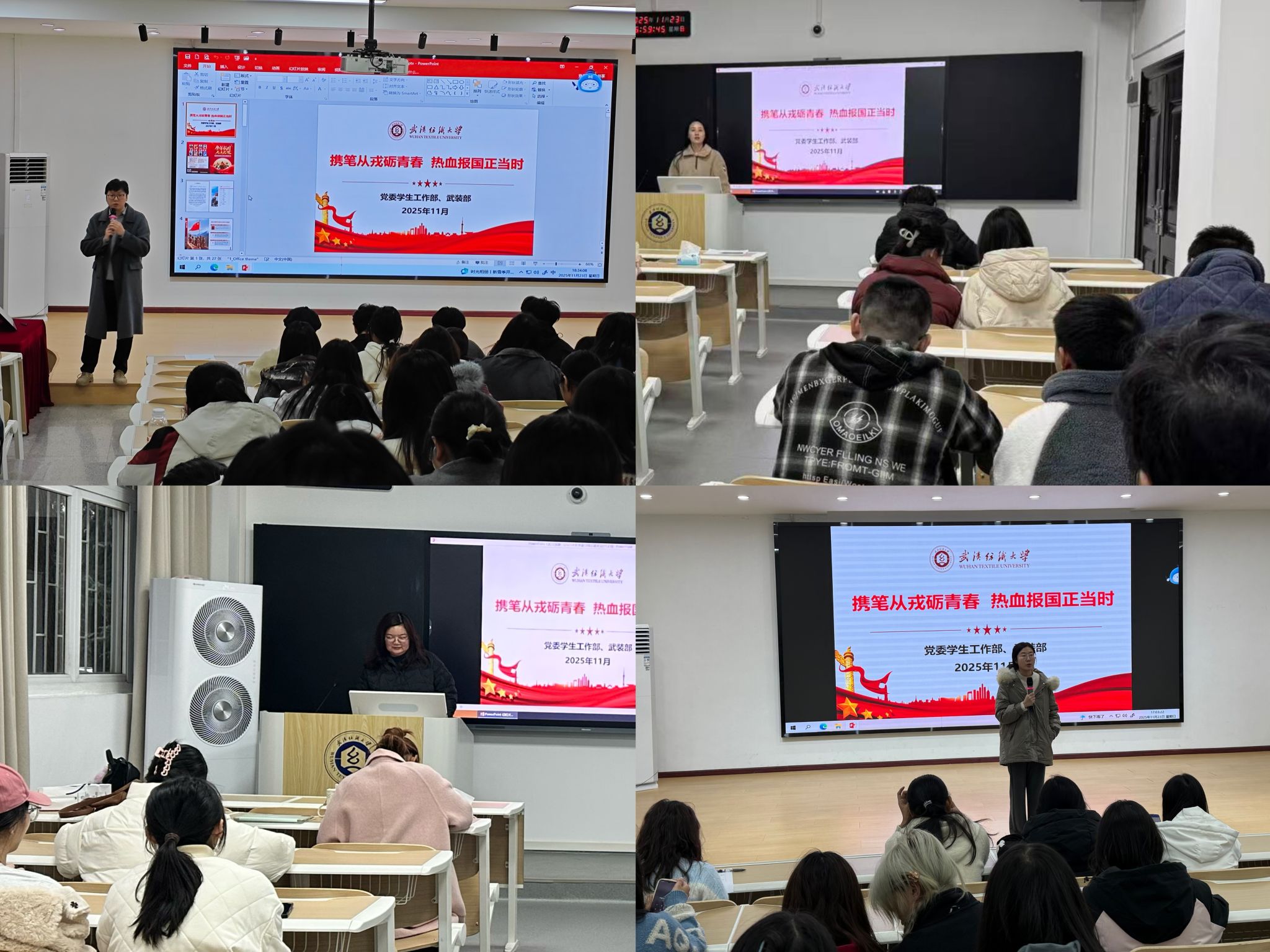 各年级辅导员以习近平总书记对广大青年的嘱托开篇,指出大学生参军入伍不仅仅是宪法法律上的义务权利,更是每一个中国青年在民族复兴中应承担的责任。通过例举必赢bwin线路检测中心历届学生应征入伍学子风采,鼓励大家磨砺青春、投身国防,让青春之花在祖国需要的地方绽放光彩。