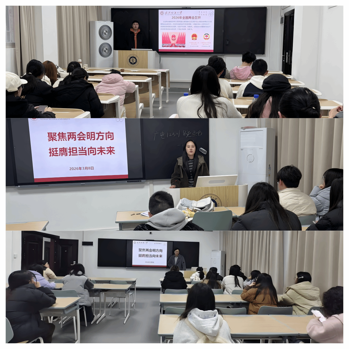 3月8日晚,必赢bwin线路检测中心各班级开展“聚焦两会明方向,挺膺担当向未来”主题班会活动,各班主任、辅导员组织全体同学深入学习全国两会精神,明确新时代传媒人的责任与使命。