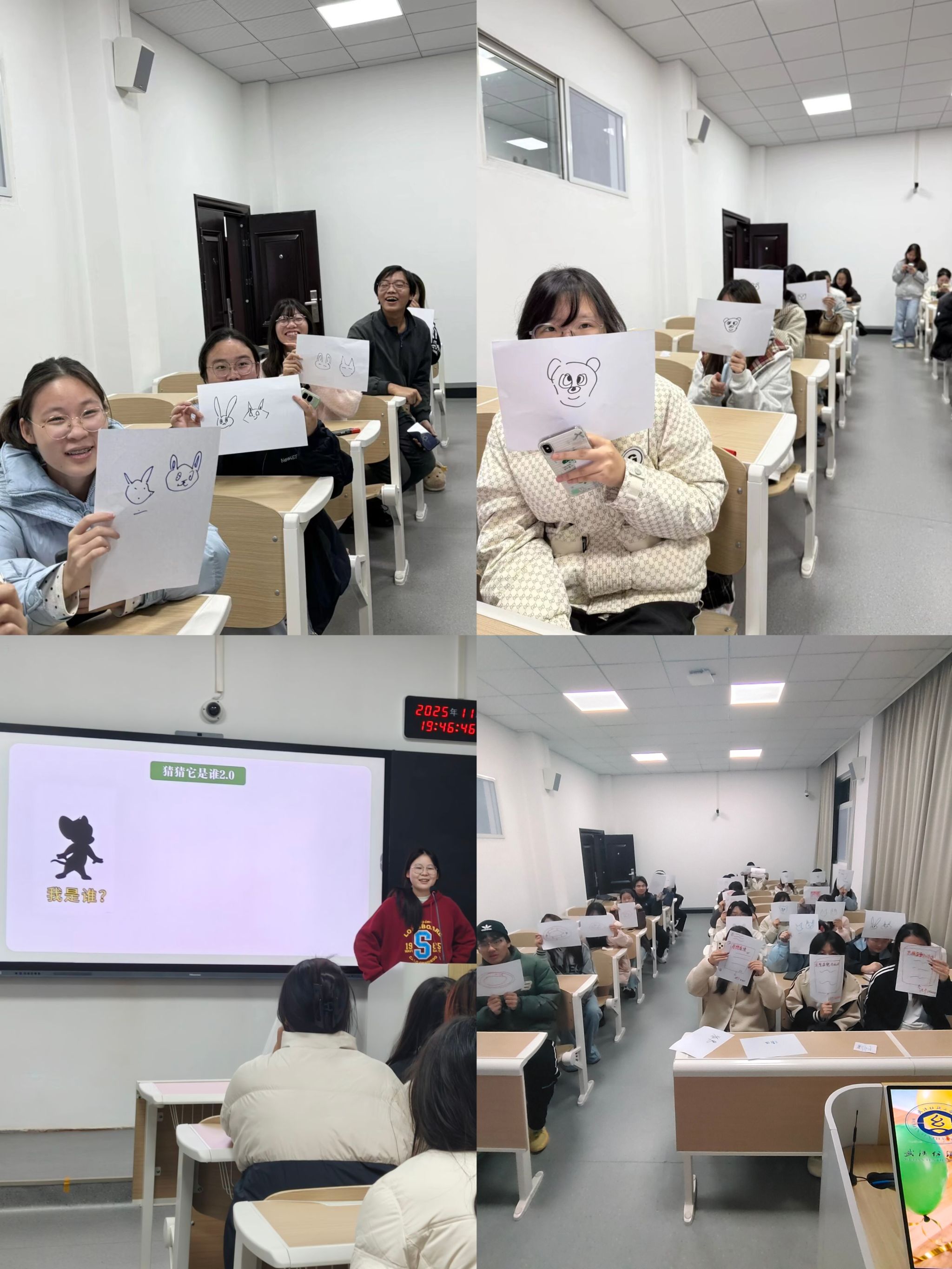 当晚,各班级教室里暖意融融,趣味十足的破冰游戏成为活动开篇的共同选择。新传12501班的“你画我猜接力” 中,同学们用线条勾勒、肢体演绎传递词语意境,巧妙的提示与可爱的“误解” 交替上演,欢笑阵阵中,画笔成了沟通的桥梁;新传12502班以“猜猜我是谁”“emoji 猜成语”等游戏唤醒童年记忆,《大耳朵图图》的经典音频、熟悉的品牌logo引发集体共鸣,同学们互相提醒、补充细节,腼腆在互动中消散,友谊在协作中萌芽;新传12504班的 “喜好大匹配” 环节独具匠心,同学们将个人爱好写在便利贴贴满黑板,一场 “寻友之旅” 让陌生的名字因共同热爱变得亲切,后续的 “肢体传形象” 游戏更是凭借趣味模仿让教室充满欢声笑语。数媒12501班则通过“你画我猜”与“故事接龙”串联起青春记忆,从“画蛇添足”的巧妙破解到“翻到旧书包”的温情续写,同学们在无声默契与集体创作中悄然拉近了心与心的距离。