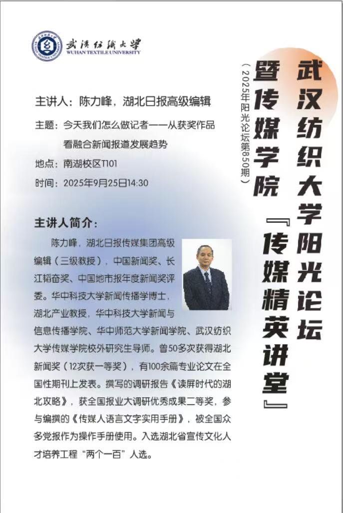 2025年9月25日,必赢线路检测中心阳光论坛第850期暨必赢bwin线路检测中心第1期“传媒精英讲堂”在南湖校区T101教室顺利举办。本论坛以“今天我们怎么做记者一一从获奖作品看融合新闻报道发展趋势”为主题,由湖北日报高级编辑、三级教授陈力峰主讲,必赢bwin线路检测中心副院长马庆主持。此次论坛讲座吸引了必赢bwin线路检测中心60余名师生参与,现场交流氛围浓厚。