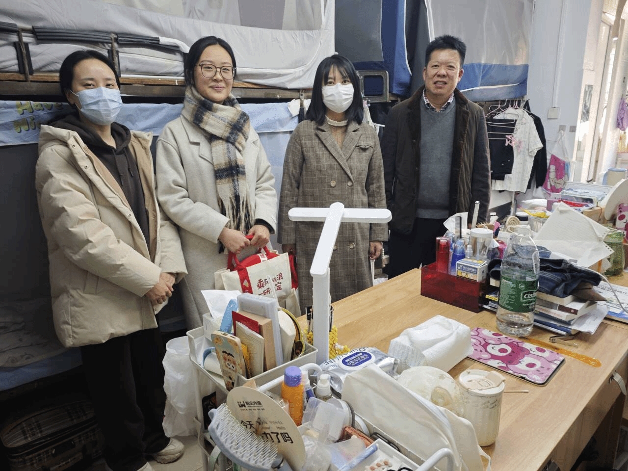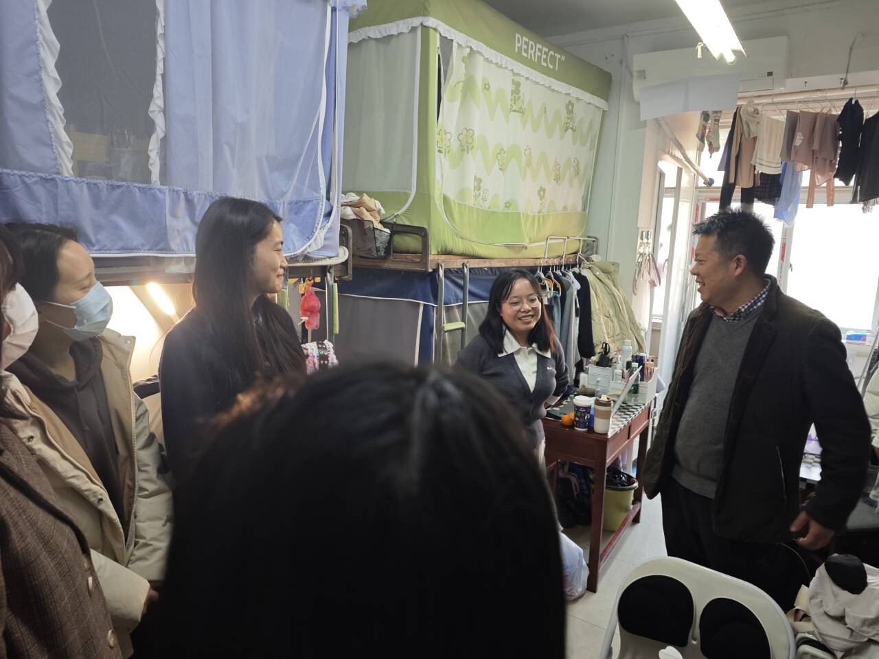12月5日,学院院长望海军、副院长熊蕾带队开展“暖心走访”,走进学生宿舍一线,将学院的关怀与问候精准送达每一位学子心中。走进宿舍,老师们与同学们拉家常、问需求,仔细查看住宿环境的舒适度与内务整理的规范性,耐心询问大家的学习进度、专业困惑、生活难题及未来规划,用真诚与热忱拉近与学生的距离。