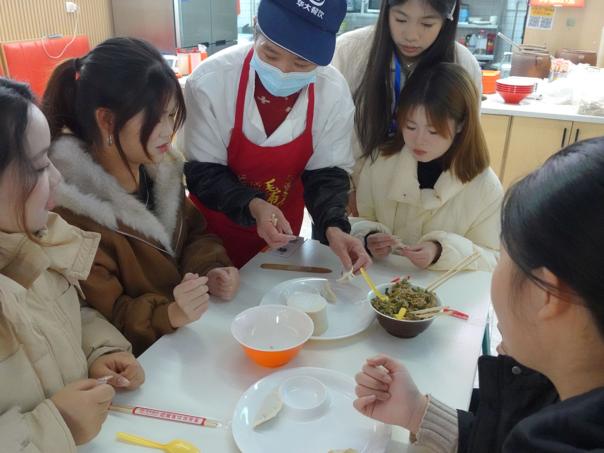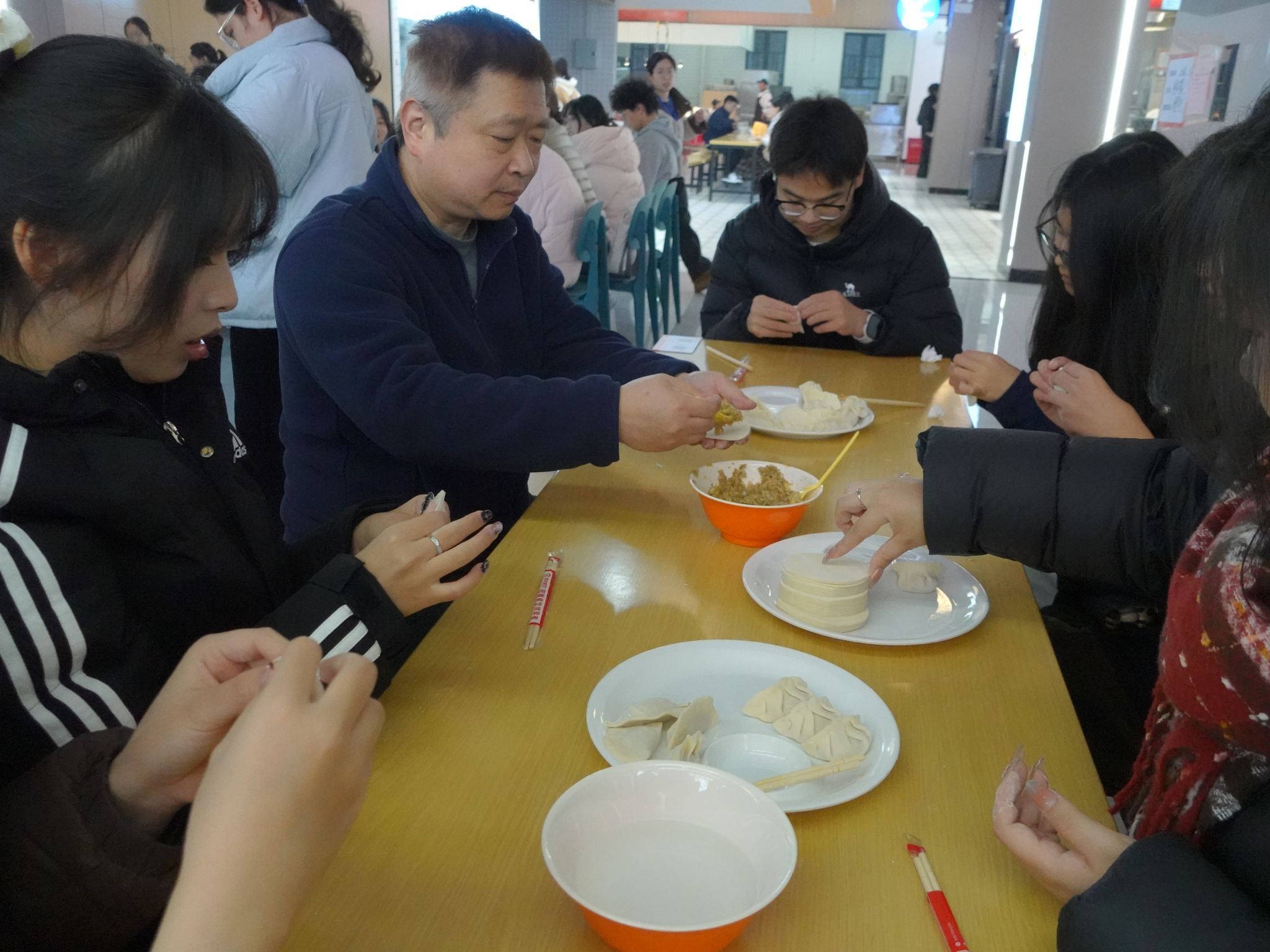 活动现场,饺子皮、馅料、凉水等物料备置齐全。师生围坐桌前,边包饺子边话家常,交流各地冬至民俗与包饺技巧。老师们和食堂阿姨手把手传授捏褶匀力等诀窍,关切询问学子学习生活近况,现场氛围温馨融洽。