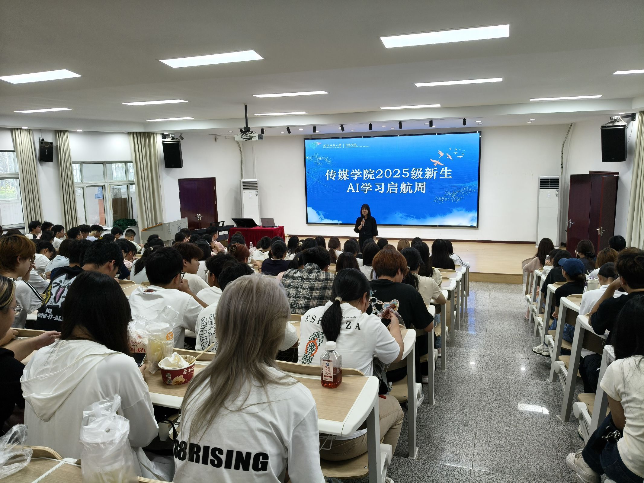 10月9日,武汉创宇极网络人工智能专家刘峰结合自身深耕软件产品用户体验设计领域的丰富经验,以“AI 技术重塑创作生态”为核心,系统解析了 AIGC(人工智能生成内容)在互联网、广告创意、电子商务、影视制作、新媒体运营等十大行业的应用场景与就业潜力。下午禾田星睿AIGC设计部门6位老师以即梦AI工具为实操载体,带领学生沉浸式体验AI 生成全流程。活动中,新生不仅初步了解了 AI 创作的核心工具、基础流程与创意逻辑,还通过实操练习完成了属于自己的简易AI 创作作品,激发了学生们对AI与创作融合领域的探索兴趣。